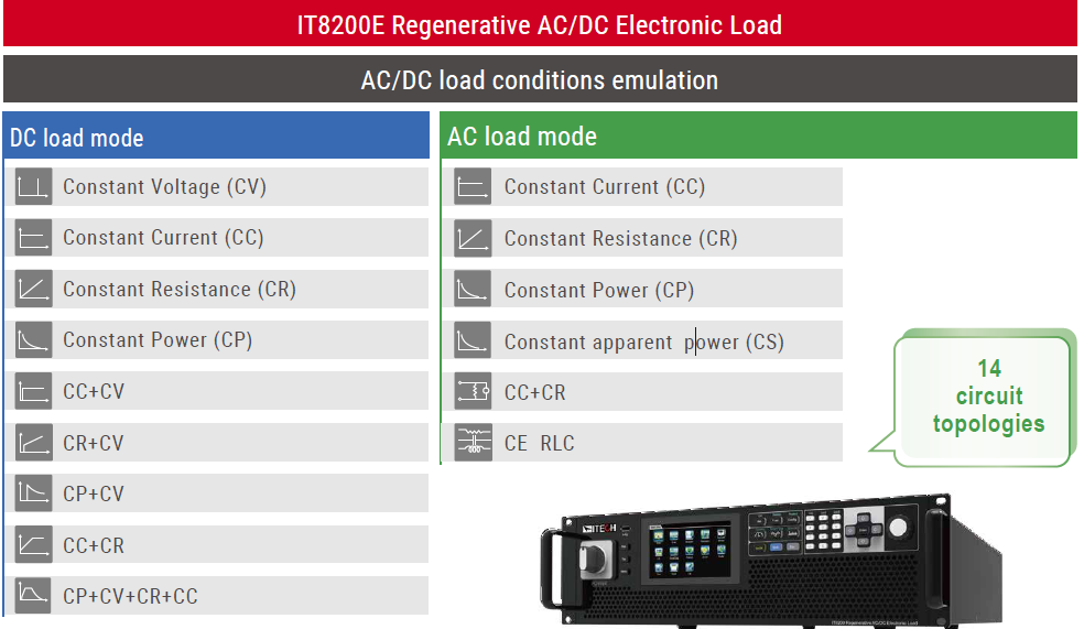 Режим переменного тока поддерживает CC/CP/CR/CS/CC+CR/CE несколько рабочих режимов, Режим CE может моделировать 14 топологий цепей, таких как однофазный выпрямитель RLC и параллельный RLC