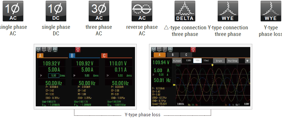 В серии IT8200E предусмотрены режимы однофазного, трехфазного и обратнофазного выхода, которые можно выбрать через меню. В режиме реверса однофазное входное напряжение 350 В может быть увеличено до 700 В при снижении мощности на 2/3 от исходной. В трехфазном режиме вы можете выбрать Y-образное или Δ-образное соединение. Y-образное соединение поддерживает потери в фазе C.