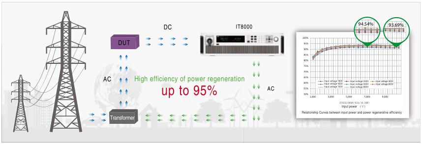 Высокая эффективность регенерации энергии. Серия IT8000 имеет уникальную функцию регенерации энергии, которая может регенерировать электрическую энергию и затем непосредственно использовать ее в установке вместо того, чтобы потреблять ее в виде тепла. Ее эффективность преобразования может достигать 95 %, что не только значительно снизит затраты пользователя на электроэнергию, но и позволит избежать использования кондиционеров или дорогостоящих систем охлаждения. Высокая плотность мощности
