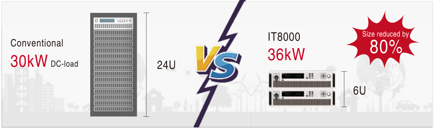 Обычные электронные нагрузки имеют не только высокое энергопотребление, но и очень большие размеры и вес. Энергопотребление электронной нагрузки с нагрузкой 30 кВт составляет не менее 24U, ее трудно транспортировать, а стоимость выше. Рекуперативная электронная нагрузка постоянного тока серии IT8000 имеет высокую плотность мощности 18 кВт при высоте всего 3U. По сравнению с обычными электронными нагрузками, размеры серии IT8000 уменьшены на 80% при той же выходной мощности.