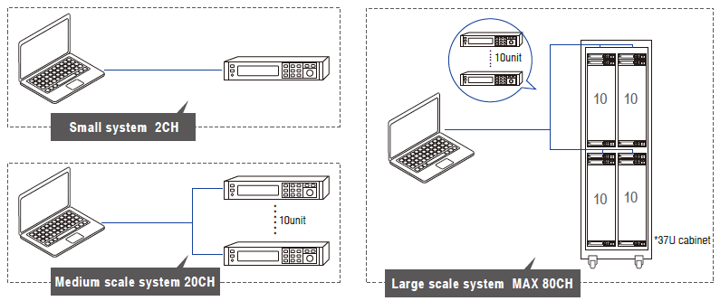 Двухканальный блок питания постоянного тока IT-M3100D имеет независимую многоканальную конструкцию, что упрощает подключение блока питания к компьютеру. Когда формируется многоканальная система питания, номер канала отображается на интерфейсе каждого источника питания. Если интерфейс связи одного из блоков подключен к компьютеру, вы можете независимо управлять каждым источником питания в системе с помощью программного обеспечения. Каждый канал может работать независимо. Шкаф 37U может включать до 40 устройств/80 каналов, что значительно повышает коэффициент использования оборудования.