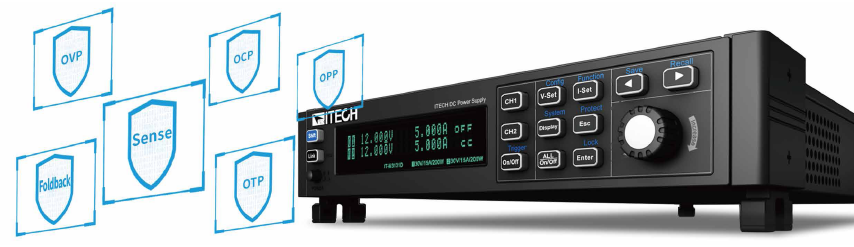 Двухканальный источник питания постоянного тока IT-M3100D имеет различные функции защиты, такие как OCP / OVP / OTP / OPP / U-Max/U-Min/Sense/Foldback. Функция Sense помогает вовремя выдать предупреждение и переключить источник питания на локальный выход при неисправности выходного терминала. Функция Foldback используется для отключения выхода при переключении питания CV / CC, чтобы защитить ИУ, чувствительные к перегрузке по напряжению и перегрузке по току.