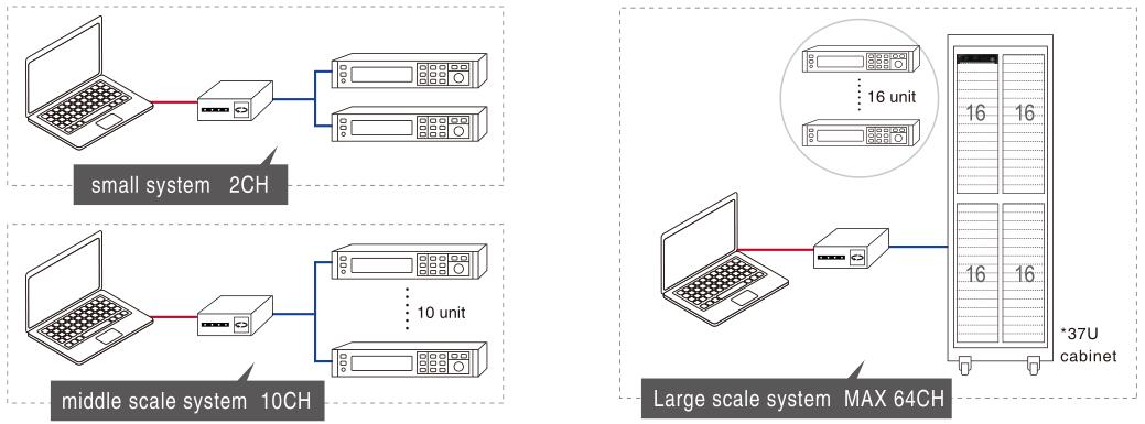 Серия IT-M3300 имеет независимую многоканальную конструкцию. Последовательность каналов будет отображаться, когда она объединяется в многоканальную систему электронной нагрузки. Пользователь может управлять каждым устройством независимо с помощью программного обеспечения GUI при подключении коммуникационного интерфейса одного устройства к ПК. Каждый канал может управляться отдельно.