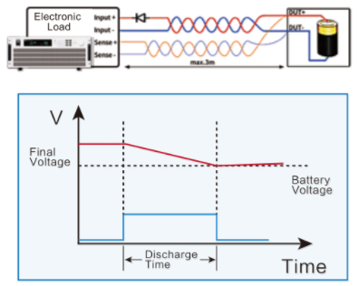 Электронная нагрузка серии IT8900A/E имеет функцию разряда батареи и может выполнять тест разряда в режиме CC, CR или CP. IT8900A/E может установить 3 условия остановки батареи: напряжение, емкость и время. При выполнении любого условия тест будет автоматически остановлен. Во время тестирования пользователи могут наблюдать за напряжением батареи, временем и уже разряженной емкостью.