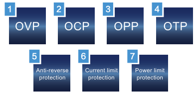 • Функции защиты: OVP, OCP, OPP, OTP, защита от колебаний тока, защита от ограниченного тока, защита от ограниченной мощности, защита от обратного сигнала и т.д.