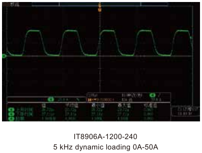 Электронная нагрузка серии IT8900A (модель 150 В) имеет динамический режим* с частотой до 30 кГц, модернизация интегрированной внутренней структуры позволила значительно улучшить отклик и стабильность контура. IT8900A может применяться для тестирования переходных характеристик импульсных источников питания, а также для тестирования переходных характеристик DC-DC преобразователей и батарей.