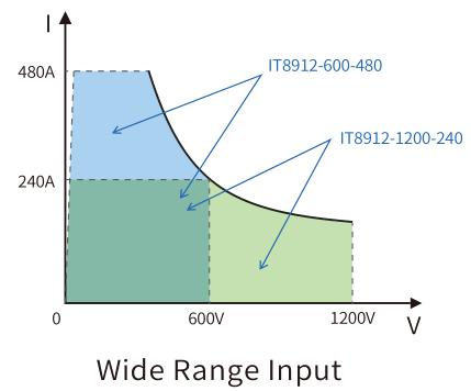 Серия IT8900A/E имеет сверхширокий диапазон входного напряжения и тока, охватывающий множество существующих моделей, отвечающих требованиям высокого тока, низкого напряжения или высокого напряжения, низкого тока.