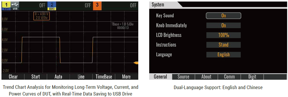 Приборы серии IT-N6300 оснащены 4,3-дюймовым цветным ЖК-дисплеем с поддержкой английского и китайского языков, что отвечает различным мировым потребностям. Интуитивно понятный интерфейс позволяет легко настраивать параметры, просматривать осциллограммы и быстро переключать языки, обеспечивая бесперебойную работу для всех пользователей. Такая конструкция повышает удобство использования, улучшает впечатления пользователей и обеспечивает совместимость в разных регионах и приложениях.
