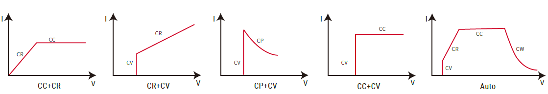 Режим СС+CV может использоваться для моделирования батарей, тестирования зарядных свай или зарядных устройств, а также для ограничения максимального тока нагрузки при работе CV. Режим AUTO позволяет автоматически переключаться между режимами CV, CR, CC и CP. При повреждении схемы защиты ИУ режим может быть автоматически переключен, чтобы избежать повреждения ИУ. Режим BSIM (моделирование батареи) позволяет выводить напряжение для имитации батареи при тестировании зарядных устройств и другого оборудования.