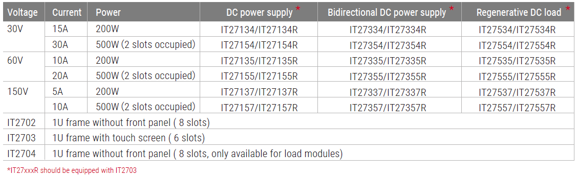 2 основных блока (1U), 3 типа модулей (источник питания постоянного тока, двунаправленный источник питания, рекуперативная нагрузка)