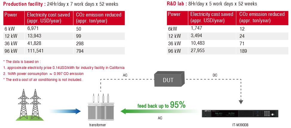 Благодаря функции рекуперации энергии IT-M3900B может возвращать до 95% энергии вместо того, чтобы потреблять ее в виде тепла. Это не только экономит ваши затраты на электроэнергию, HVAC и охлаждающую инфраструктуру, но и помогает снизить выбросы углекислого газа и воздействие на окружающую среду. Кроме того, IT-M3900B имеет функцию автоматического обнаружения сети, которая может определять фазовое напряжение и частоту в режиме реального времени и синхронизируется с сетью, чтобы сделать регенерацию энергии автоматической и безопасной.