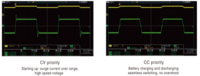 IT6000B имеет функцию приоритета CC/CV, которая является новейшей концепцией в отрасли. Она может удовлетворить различные запросы приложений, такие как высокая скорость или отсутствие перегрузки, и сделать тест более гибким. Пользователи могут выбрать время отклика петли CC/CV и режим работы петли, чтобы решить, что на выходе будет высокоскоростной режим напряжения или режим тока без перегрузки. Эта уникальная функция делает его пригодным для применения при тестировании мощных интегральных схем, зарядке и разрядке, моделировании переходных процессов в автомобильной электронике и т.д.