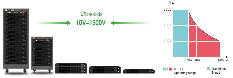 Серия IT-M3800 насчитывает 25 моделей, с напряжением от 10 В ~ 1500 В и током до 720 А. Широкий диапазон дизайна предоставляет пользователям больше комбинаций напряжения и тока, чем традиционные нагрузки постоянного тока с фиксированным диапазоном, что делает ее более гибкой. Одно устройство может покрыть широкий спектр применений, значительно снижая сложность построения системы и экономя место.